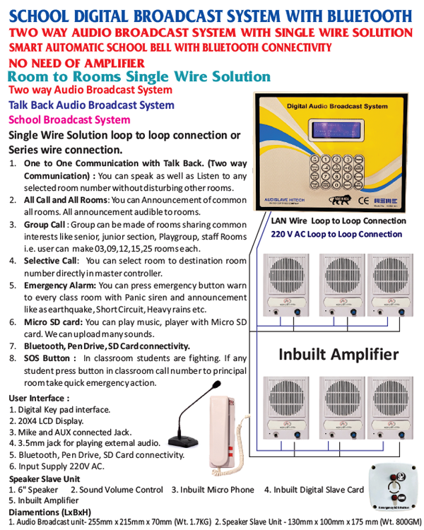 School digital broadcast system with bluetooth two way audio broadcast system with single wire solution smart automatic school bell with bluetooth connectivity.